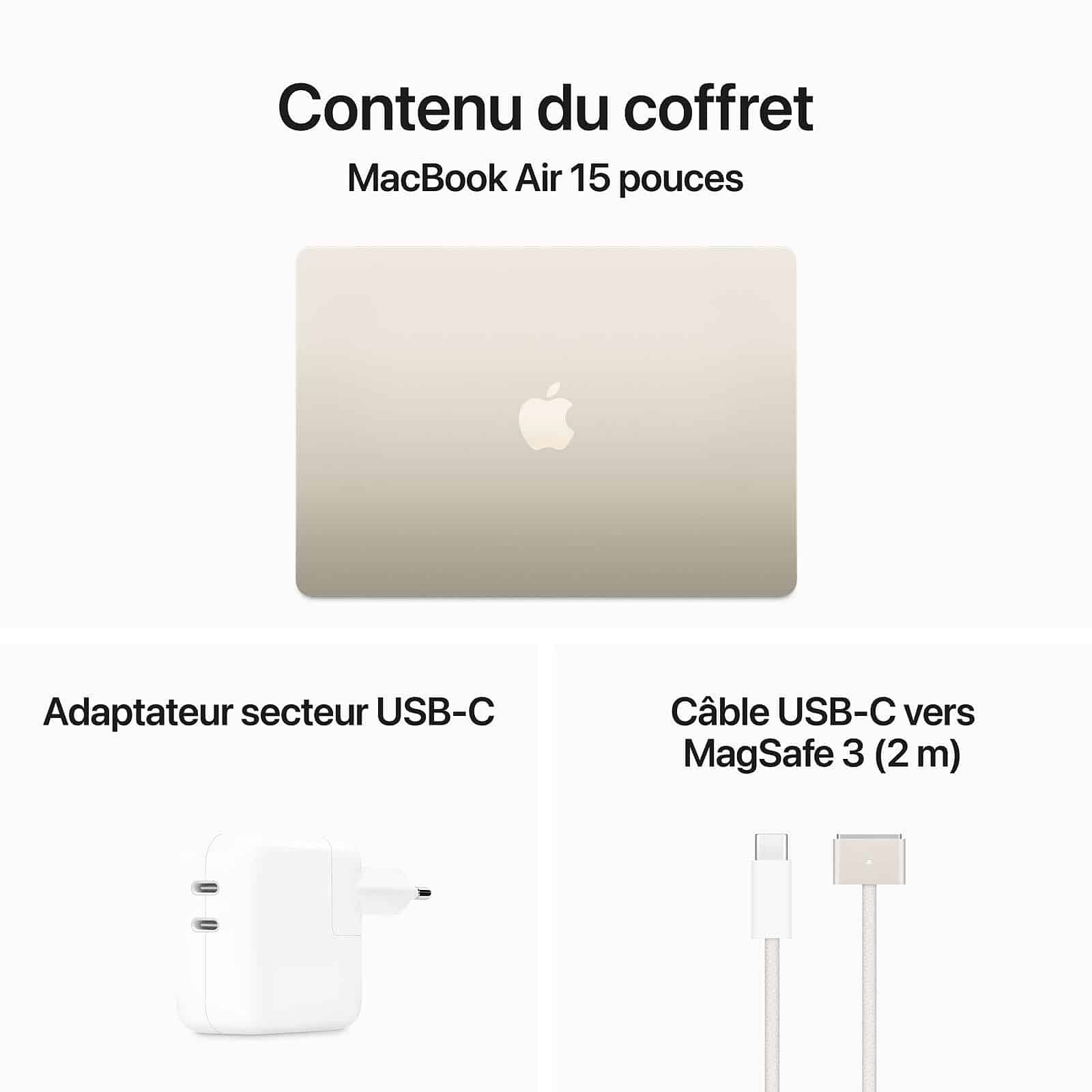 Avec sa finition Lumière stellaire, son châssis fin et léger, le MacBook Air 15 pouces incarne l’élégance et la portabilité Apple. Un ordinateur pensé pour vous accompagner partout, avec style.
